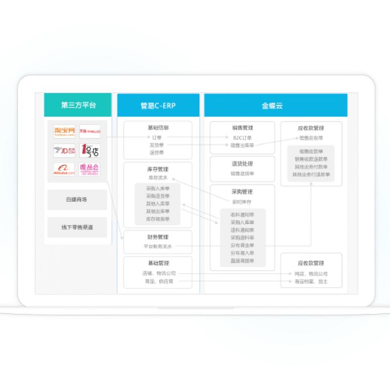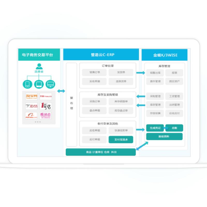 管易云C-ERP與金蝶K/3 WISE對接,幫助中小企業(yè)實(shí)現一體化經(jīng)營(yíng)? 多個(gè)電商平臺訂單統一顯示,集中處理? 線(xiàn)下庫存與線(xiàn)上電商平臺庫存一體化管理? 線(xiàn)上線(xiàn)下數據共享,電商業(yè)務(wù)與線(xiàn)下財務(wù)一體? 線(xiàn)下管理系統進(jìn)
